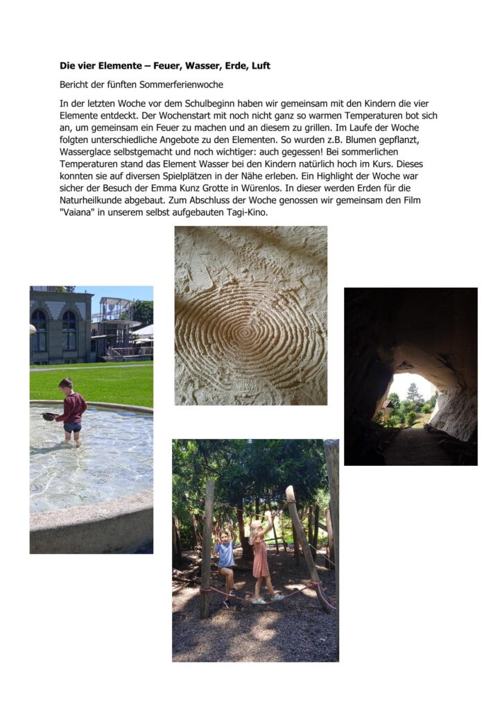 In der letzten Woche vor dem Schulbeginn haben wir gemeinsam mit den Kindern die vier Elemente entdeckt. Der Wochenstart mit noch nicht ganz so warmen Temperaturen bot sich an, um gemeinsam ein Feuer zu machen und an diesem zu grillen. Im Laufe der Woche folgten unterschiedliche Angebote zu den Elementen. So wurden z.B. Blumen gepflanzt, Wasserglace selbstgemacht und noch wichtiger: auch gegessen! Bei sommerlichen Temperaturen stand das Element Wasser bei den Kindern natürlich hoch im Kurs. Dieses konnten sie auf diversen Spielplätzen in der Nähe erleben. Ein Highlight der Woche war sicher der Besuch der Emma Kunz Grotte in Würenlos. In dieser werden Erden für die Naturheilkunde abgebaut. Zum Abschluss der Woche genossen wir gemeinsam den Film «Vaiana» in unserem selbst aufgebauten Tagi-Kino.